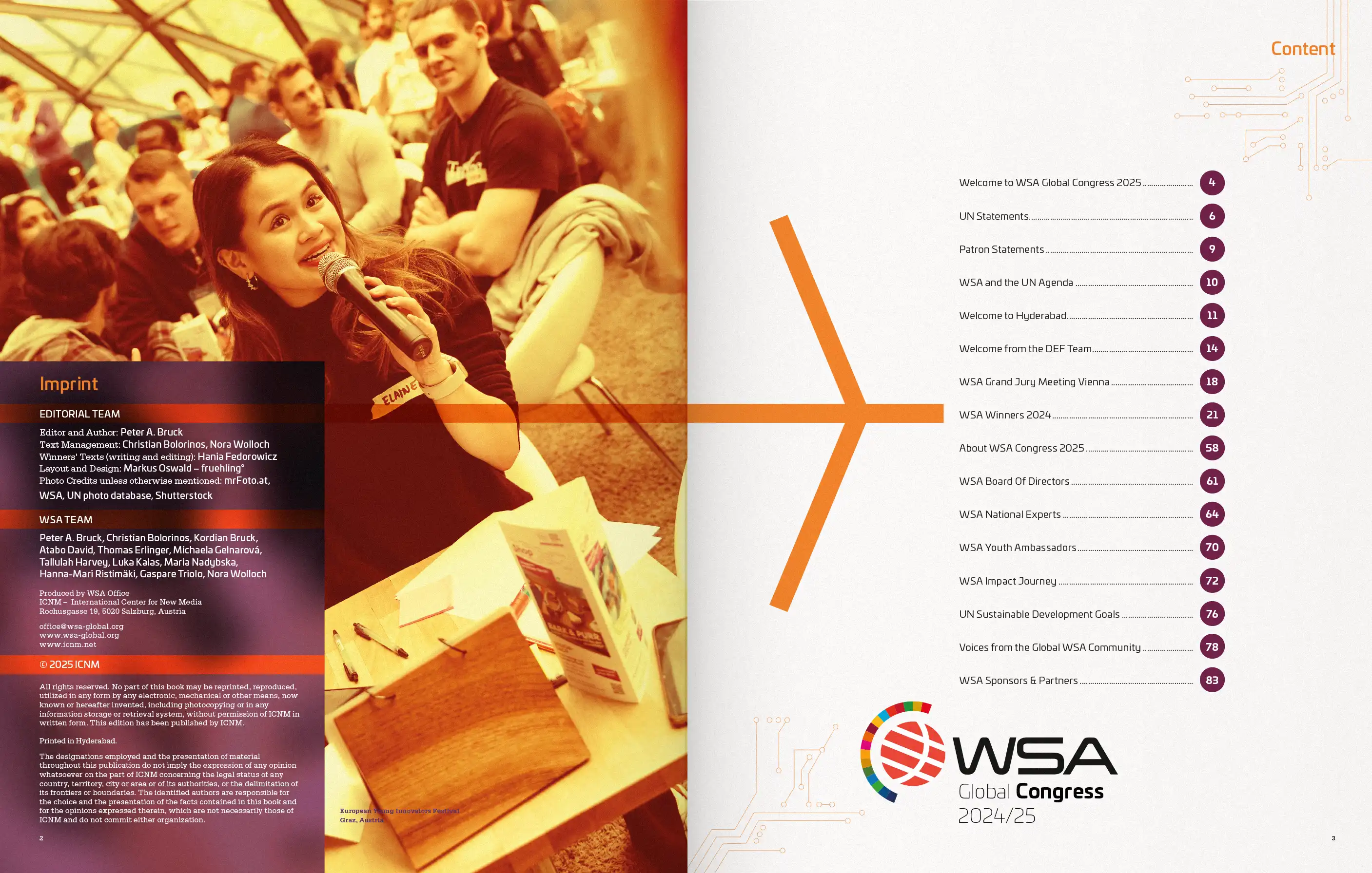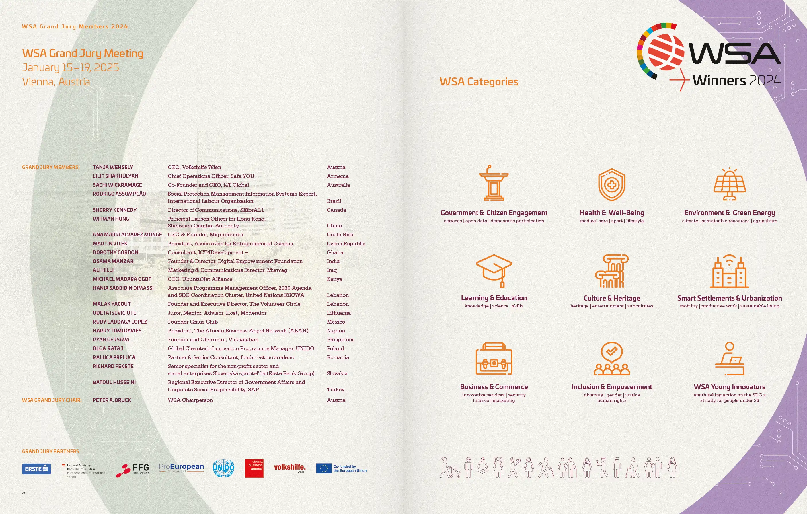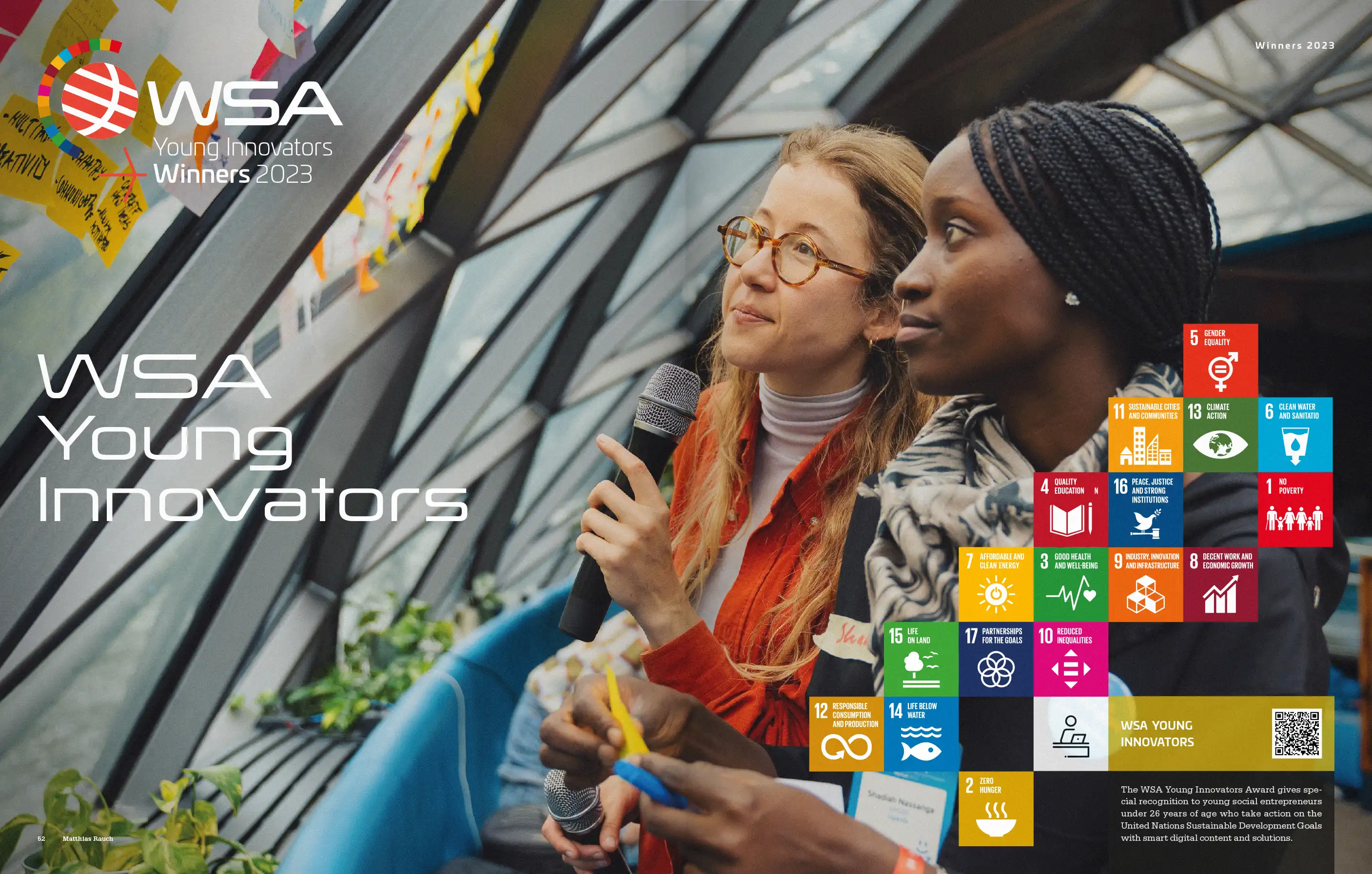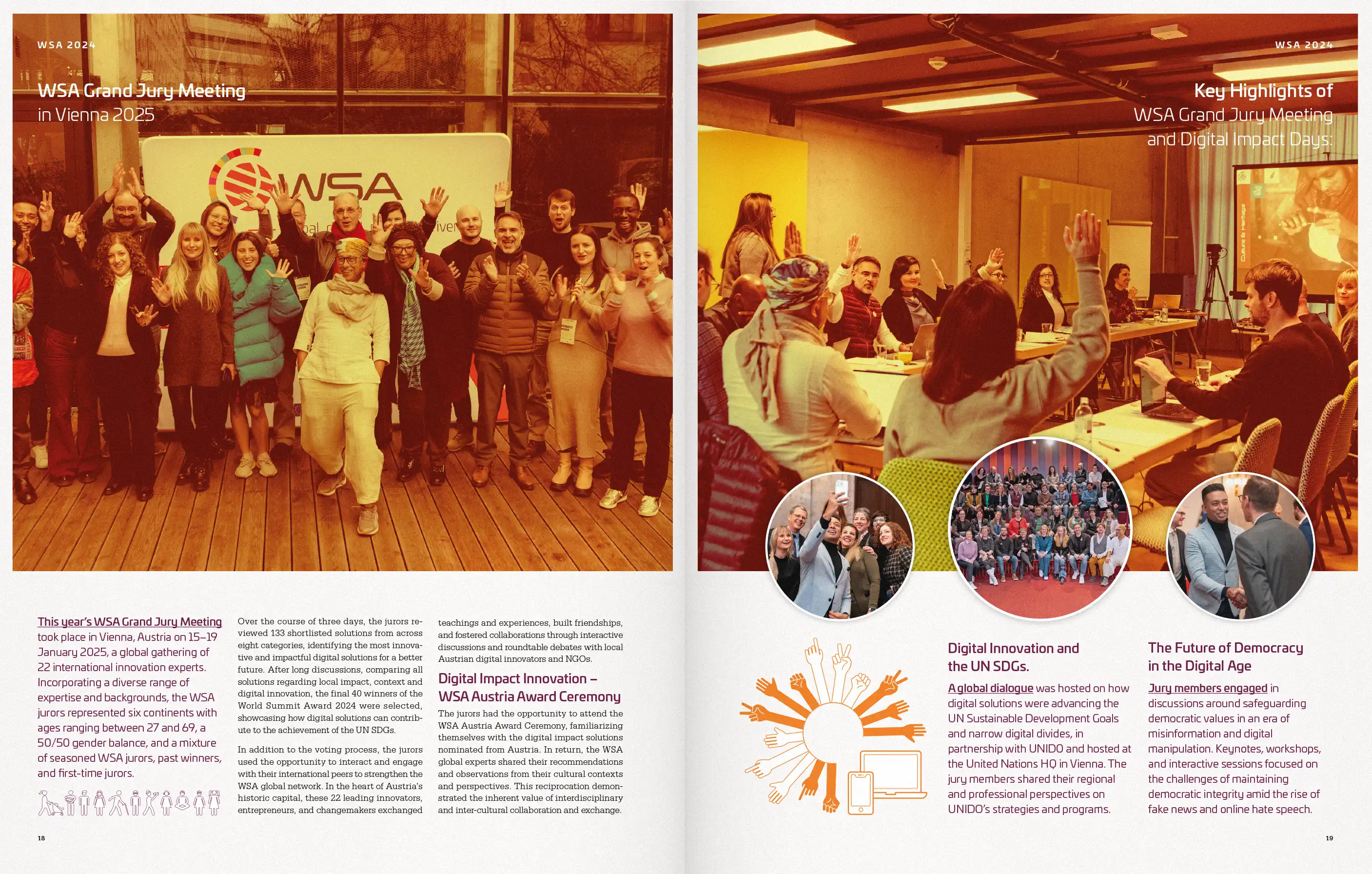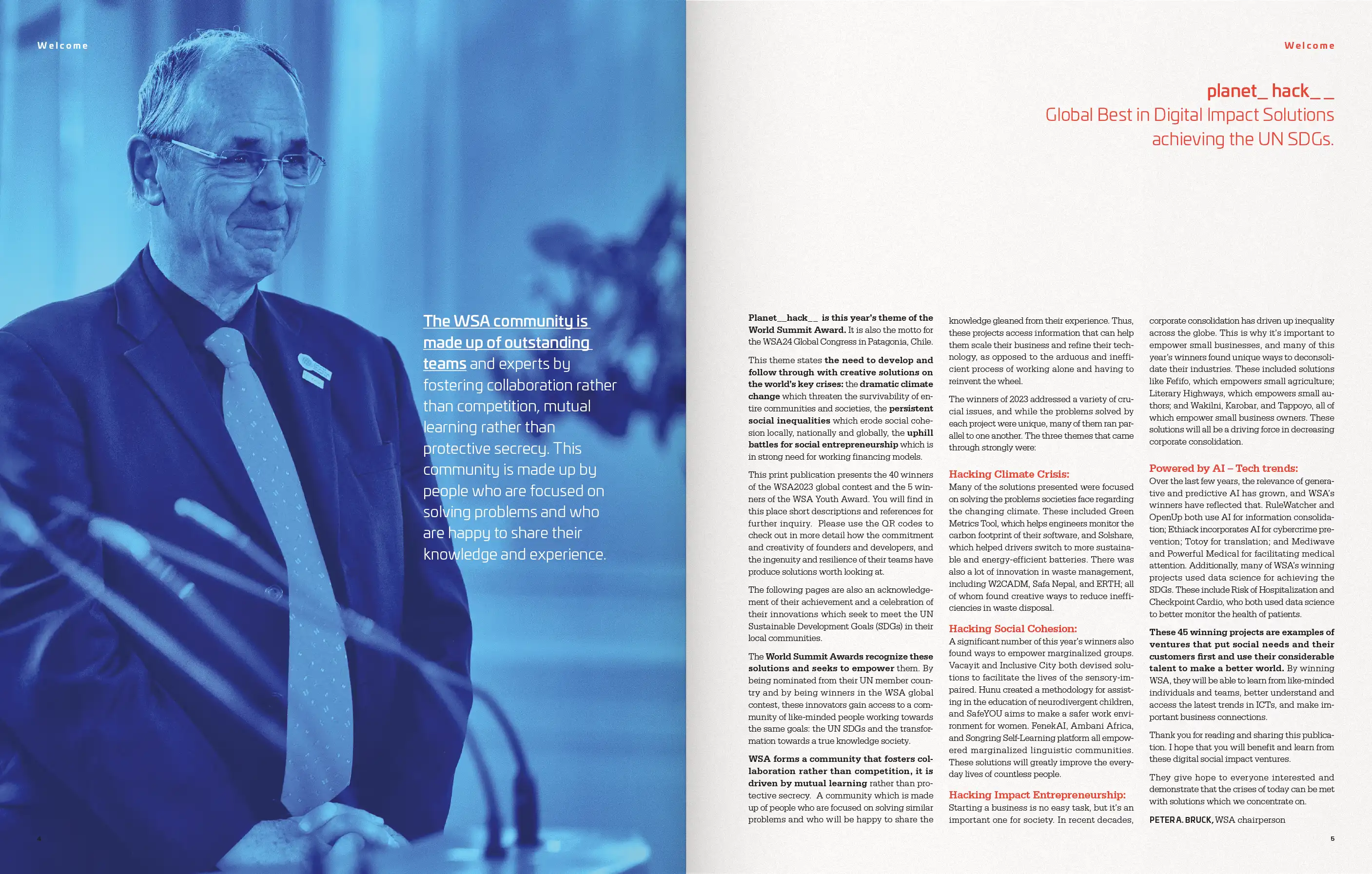 World Summit Award Im Jänner 2023 übernahmen wir zum ersten mal den Auftrag für das Graphic Design von Erscheinungsbild und Katalog zum WSA Global Congress. WSA prämiert die innovativsten Projekte und Konzepte die zur Erreichung der UN Sustainable Development Goals beitragen sollen.