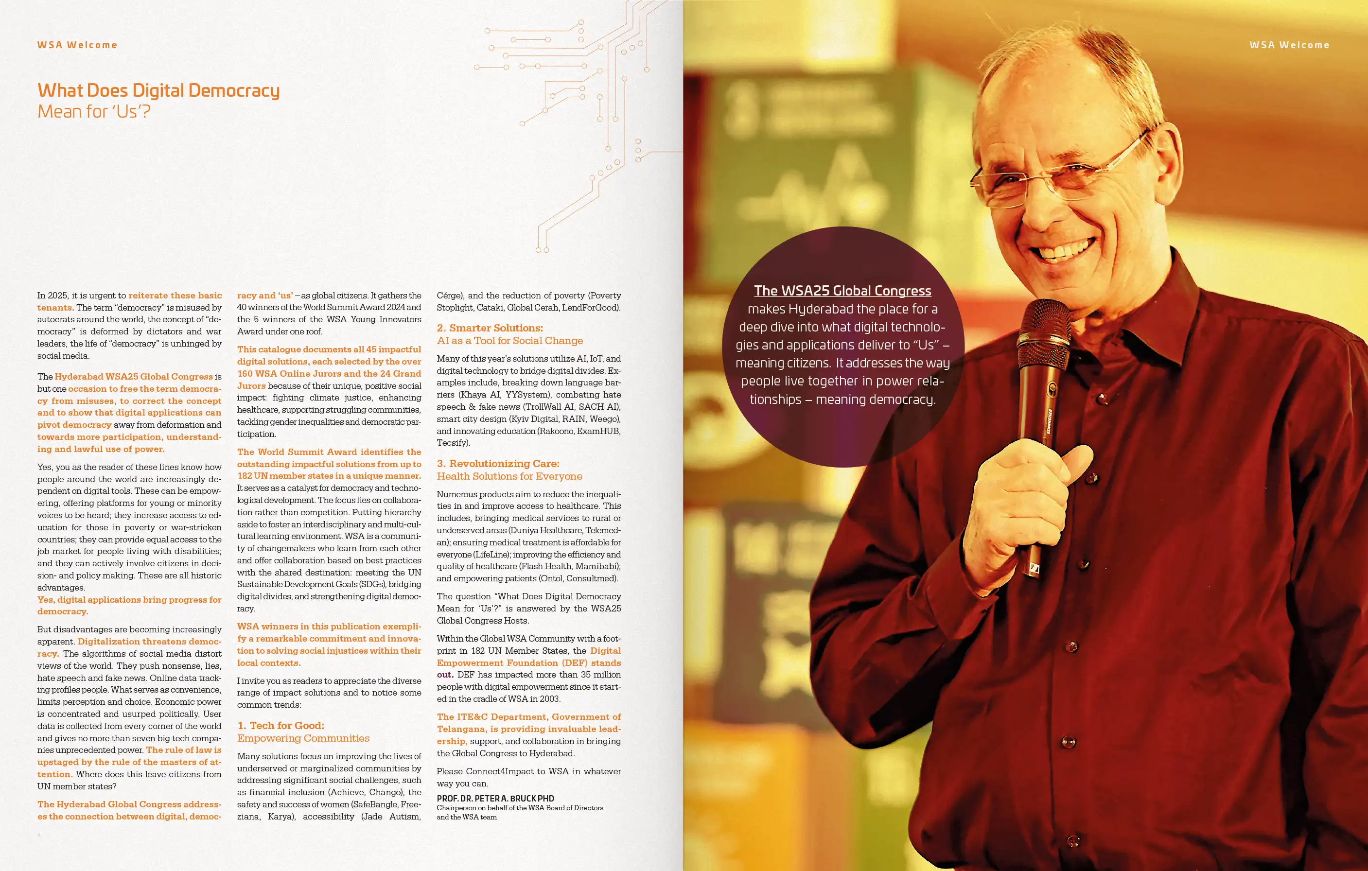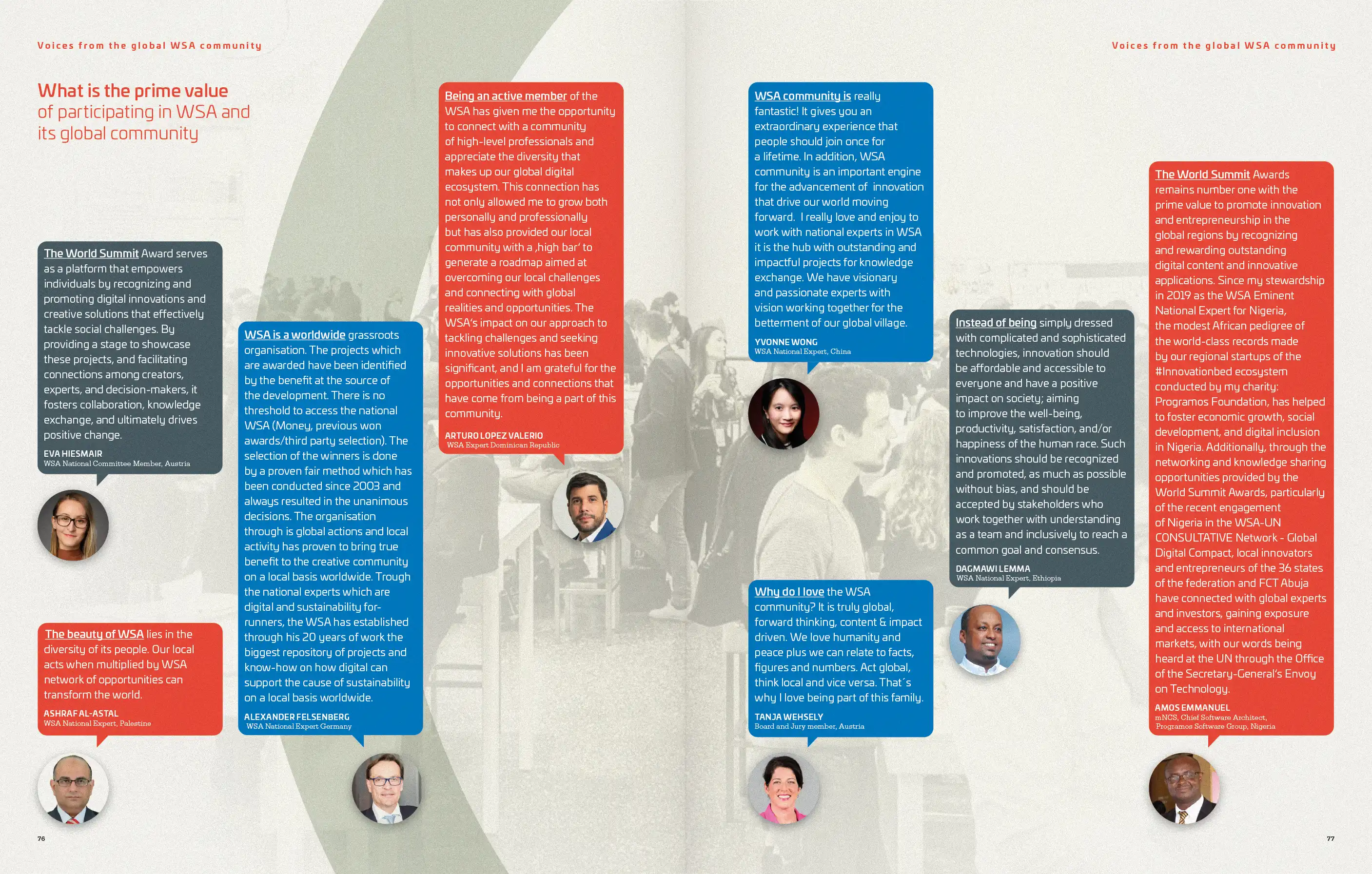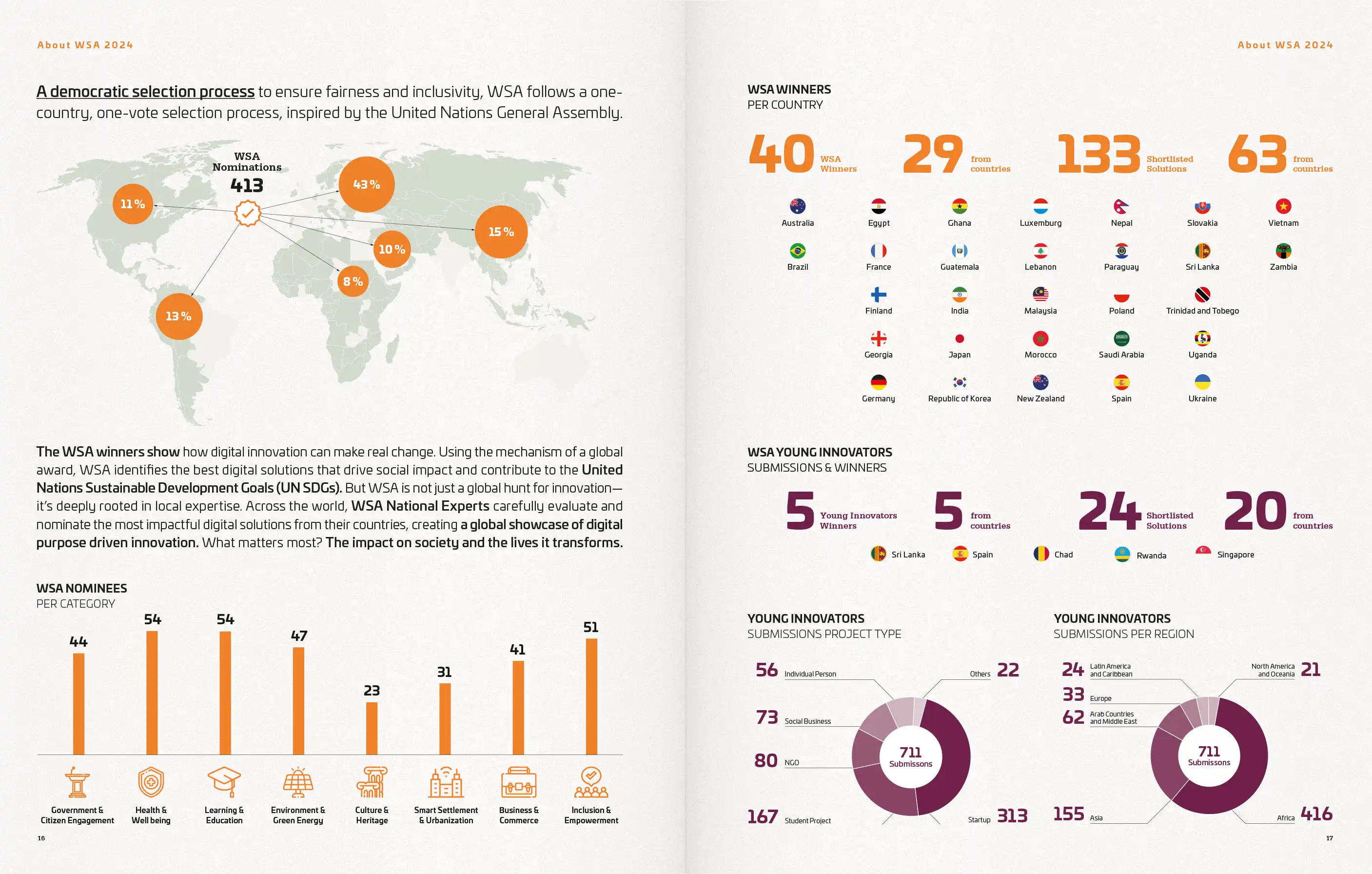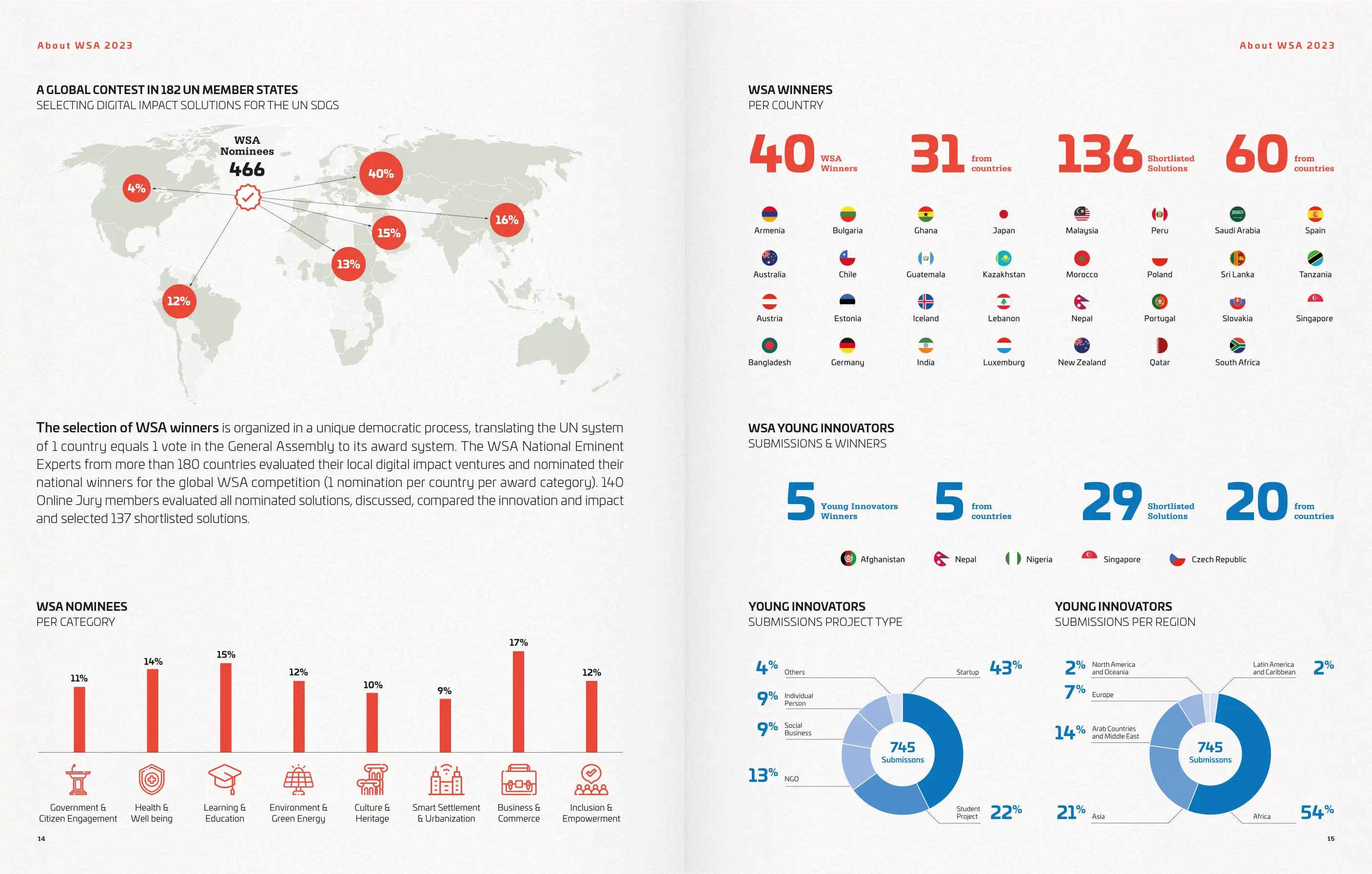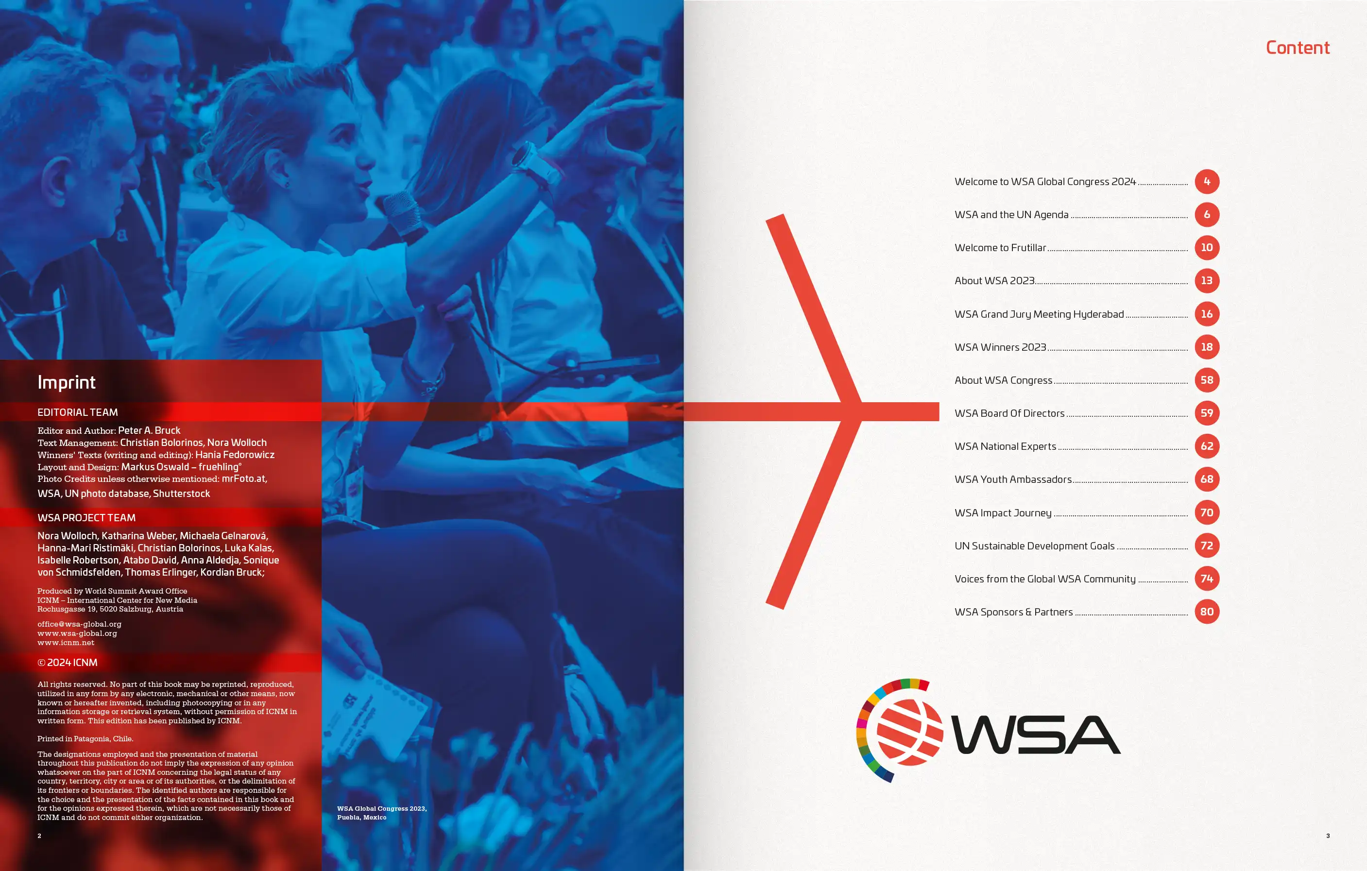World Summit Award Im Jänner 2023 übernahmen wir zum ersten mal den Auftrag für das Graphic Design von Erscheinungsbild und Katalog zum WSA Global Congress. WSA prämiert die innovativsten Projekte und Konzepte die zur Erreichung der UN Sustainable Development Goals beitragen sollen.