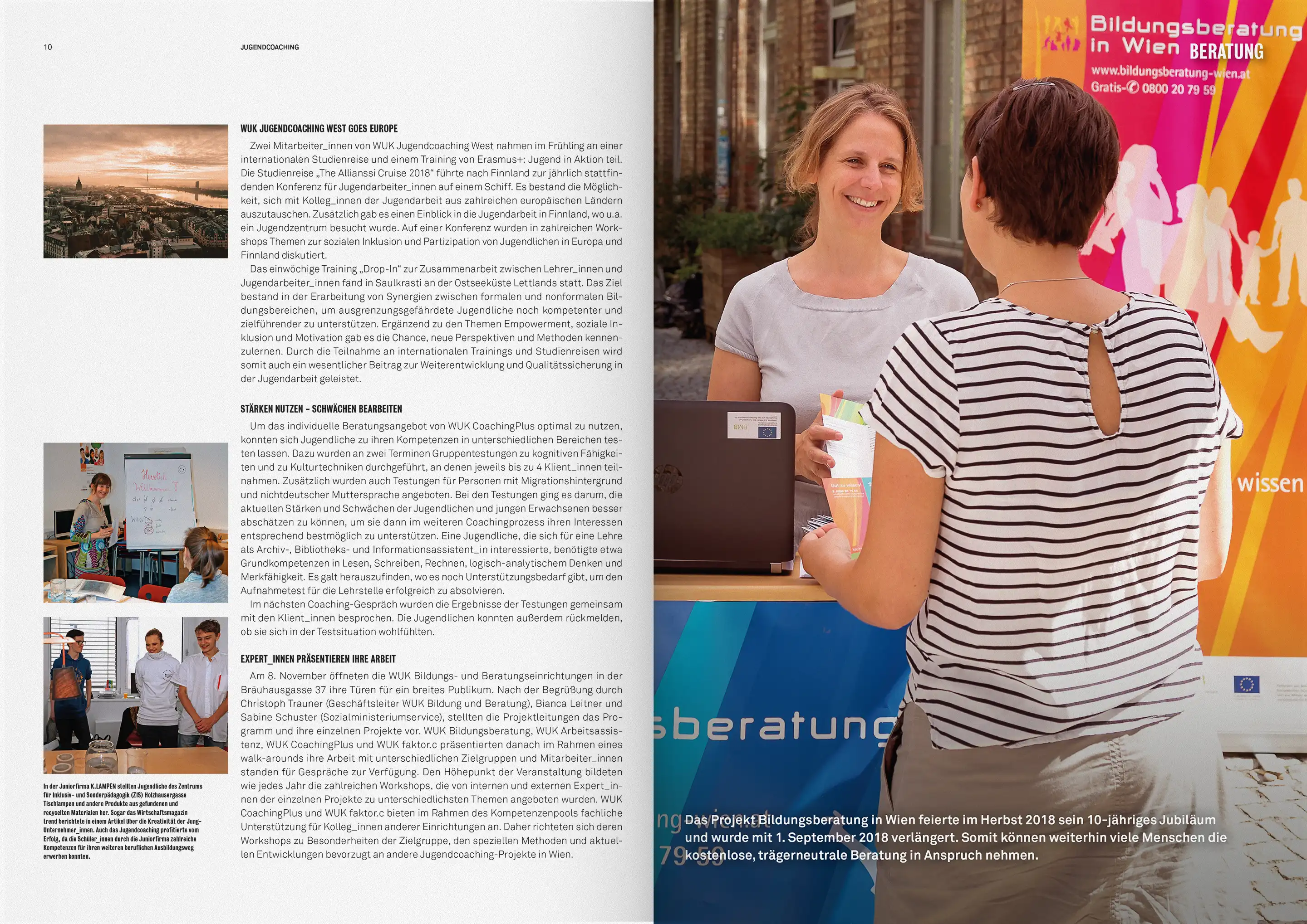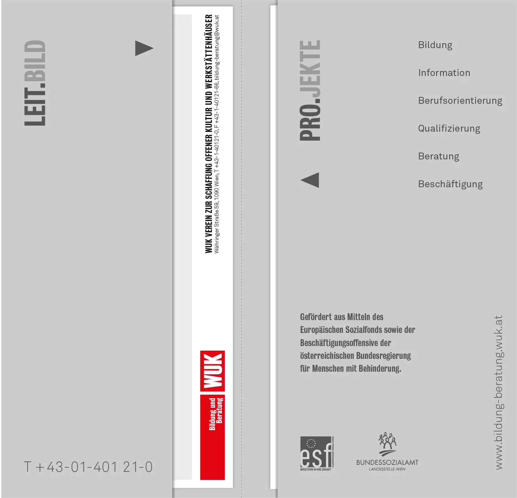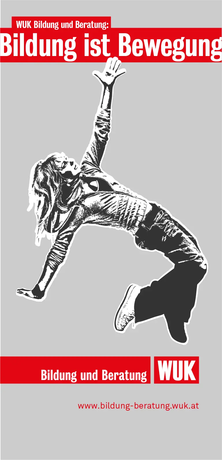 WUK Bildung und Beratung richtet sich an junge Menschen, mit Problemen auf dem primären Bildungsweg. Der Claim „Bildung ist Bewegung“ verweist auf die Aktivierung und Selbstermächtigung der Klienten. Als Anspielung auf die politische Relevanz des Themas, nimmt die Typografie Anleihen bei der Boulevard-Presse und kombiniert diese mit Visuals, die sich, im Street-Art-Stil, auf aktuelle, bildungspolitische Themen beziehen.