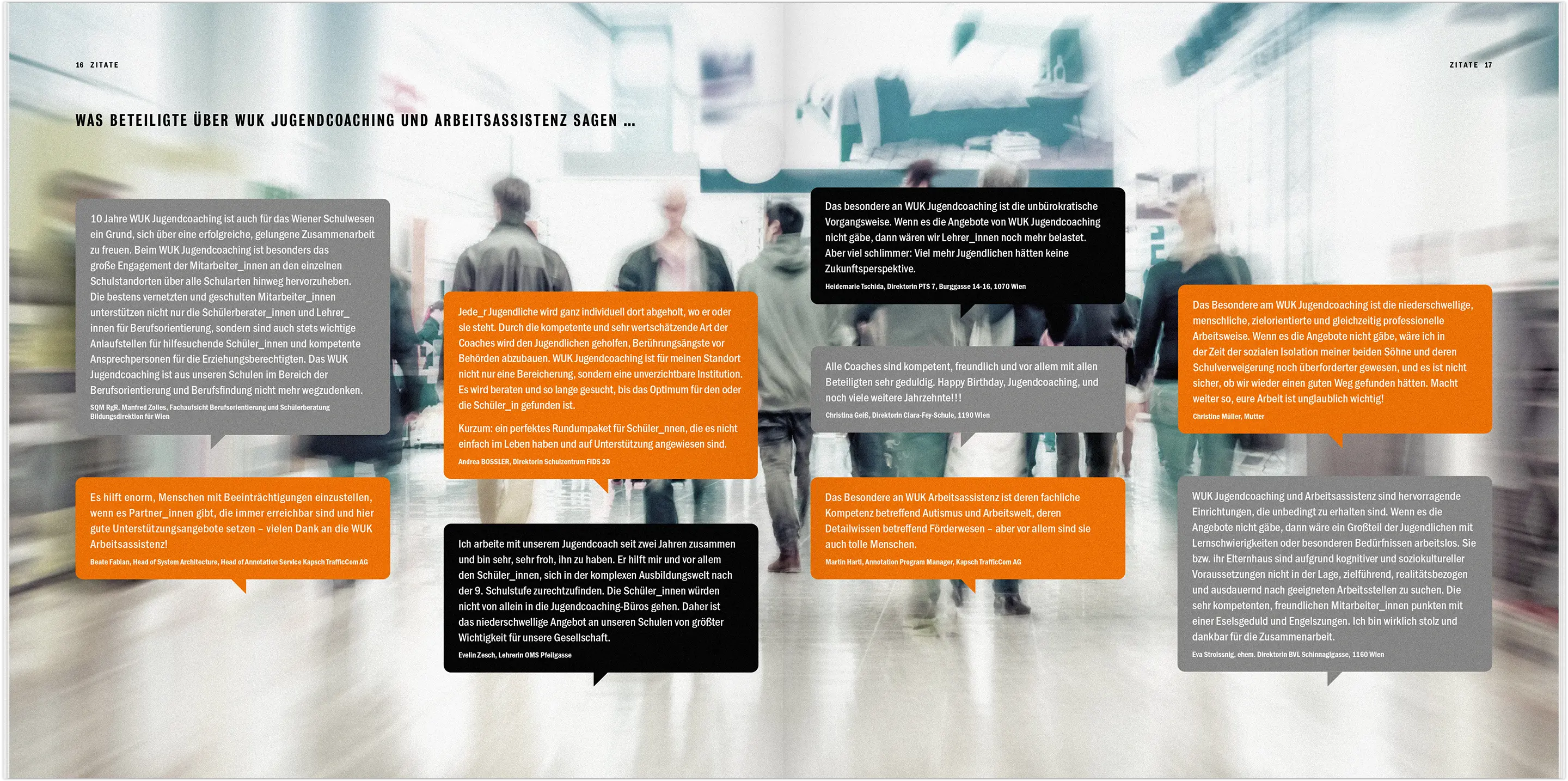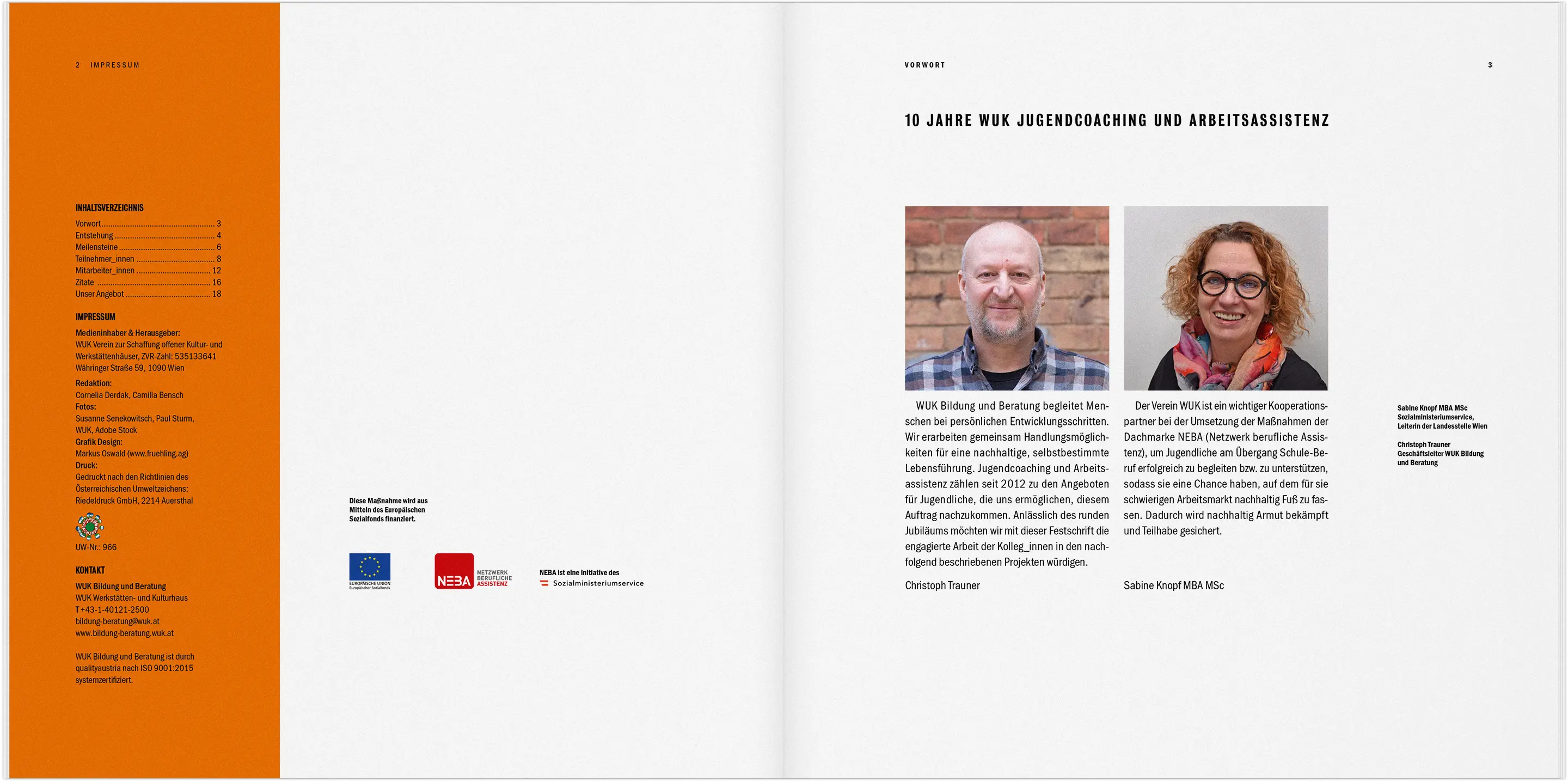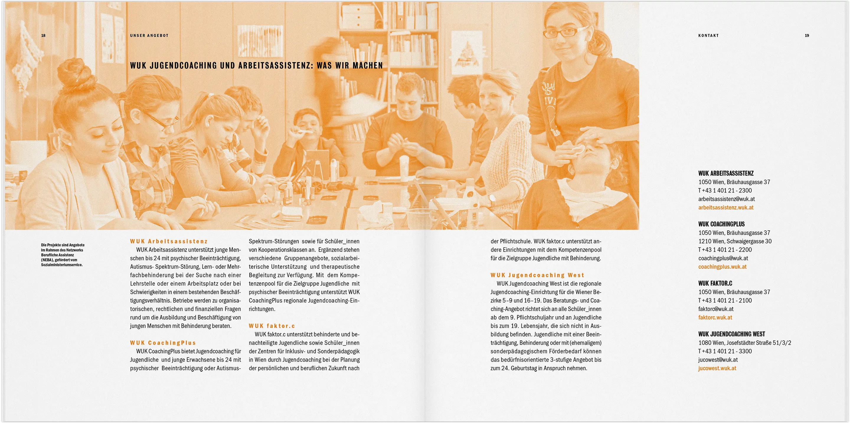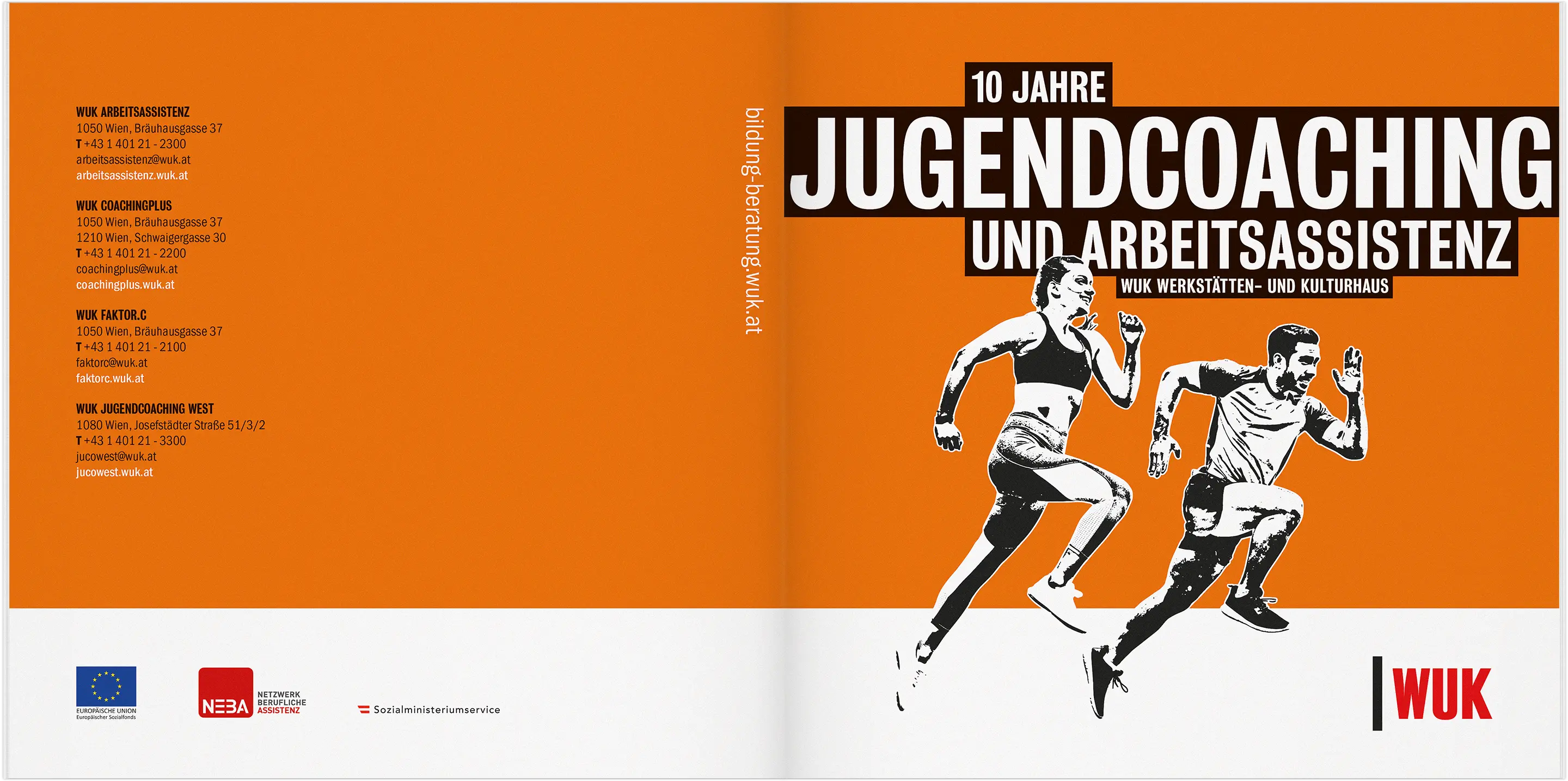 WUK Jugendcoaching. Präsentation des Projektes zum 10 Jahres Jubiläum. In Form einer Imagebroschüre und eines Imagevideos sollte die Arbeit in den Projekten präsentiert werden. Das neue Branding für die Projekte lieferte die gestalterische Basis für die Gestaltung von Broschüre und Video.