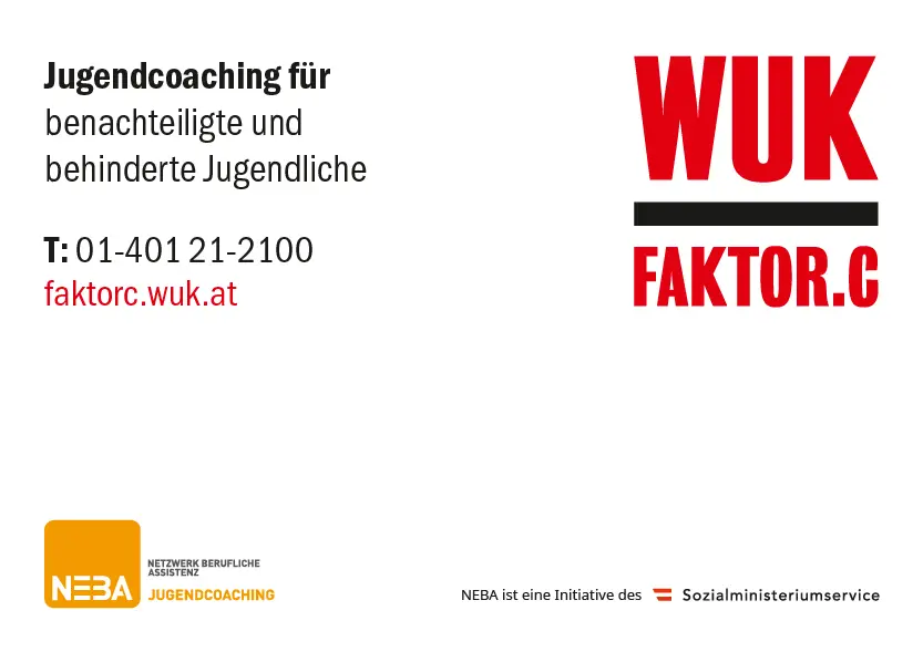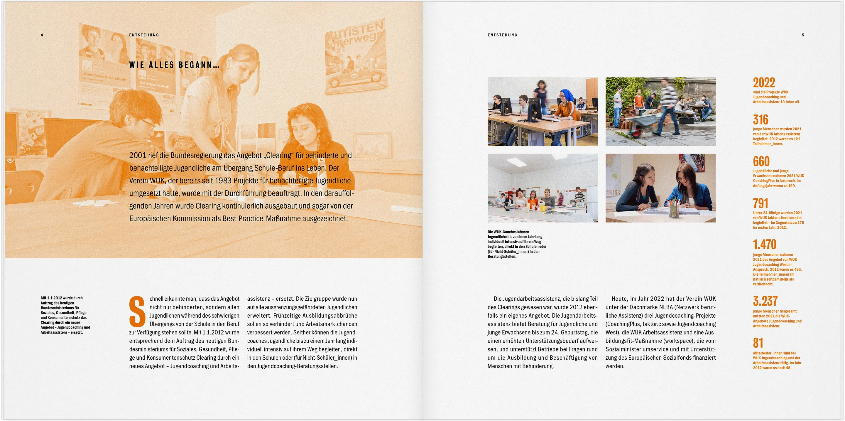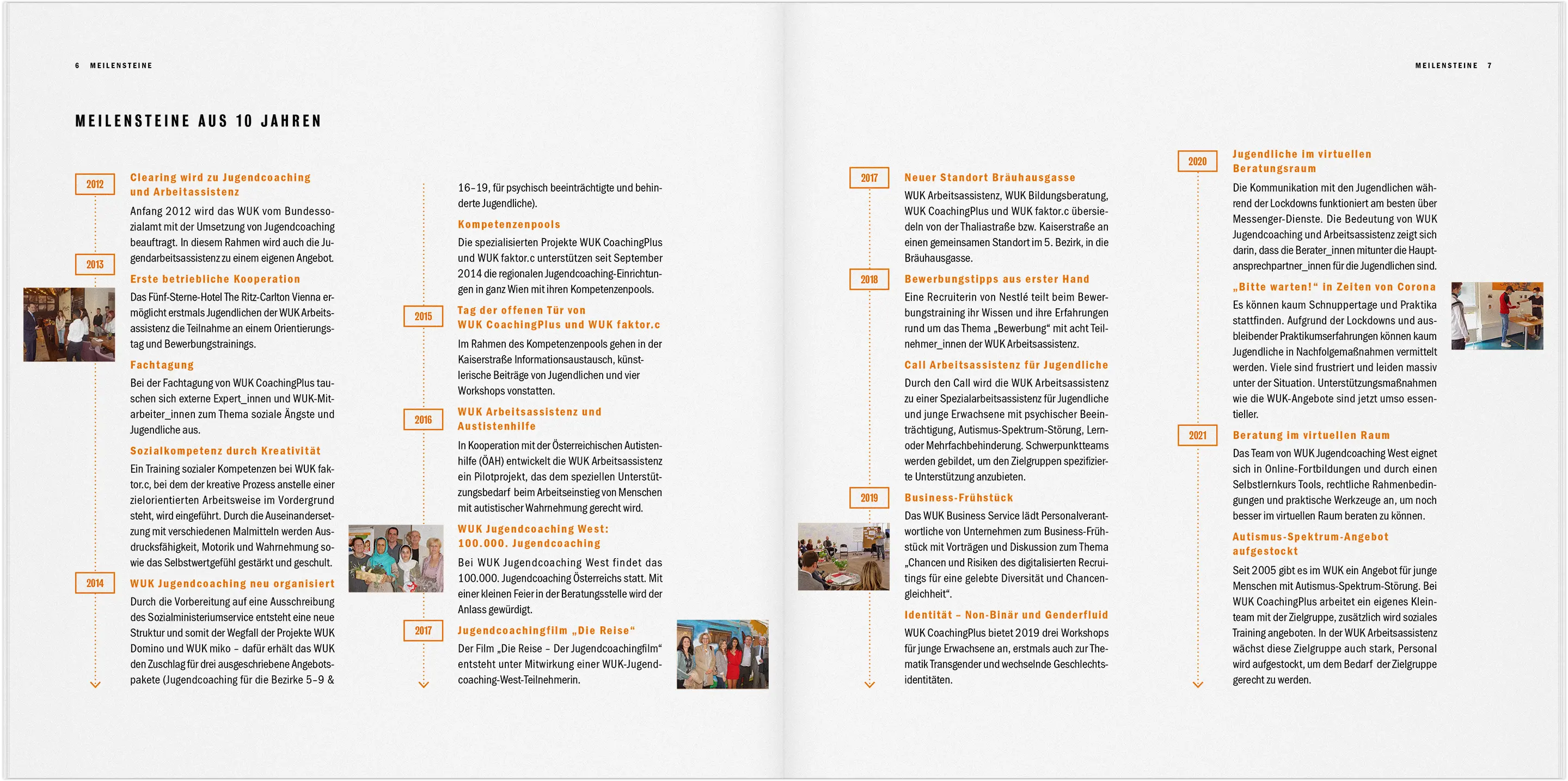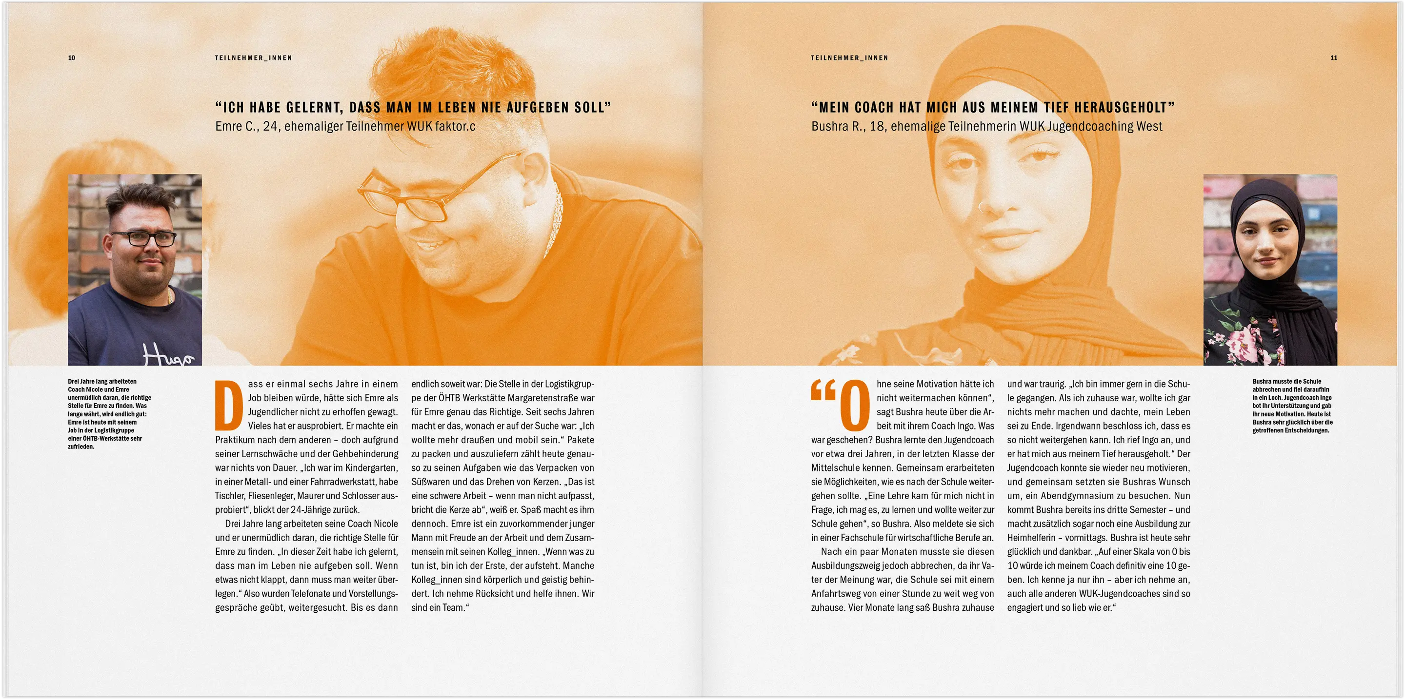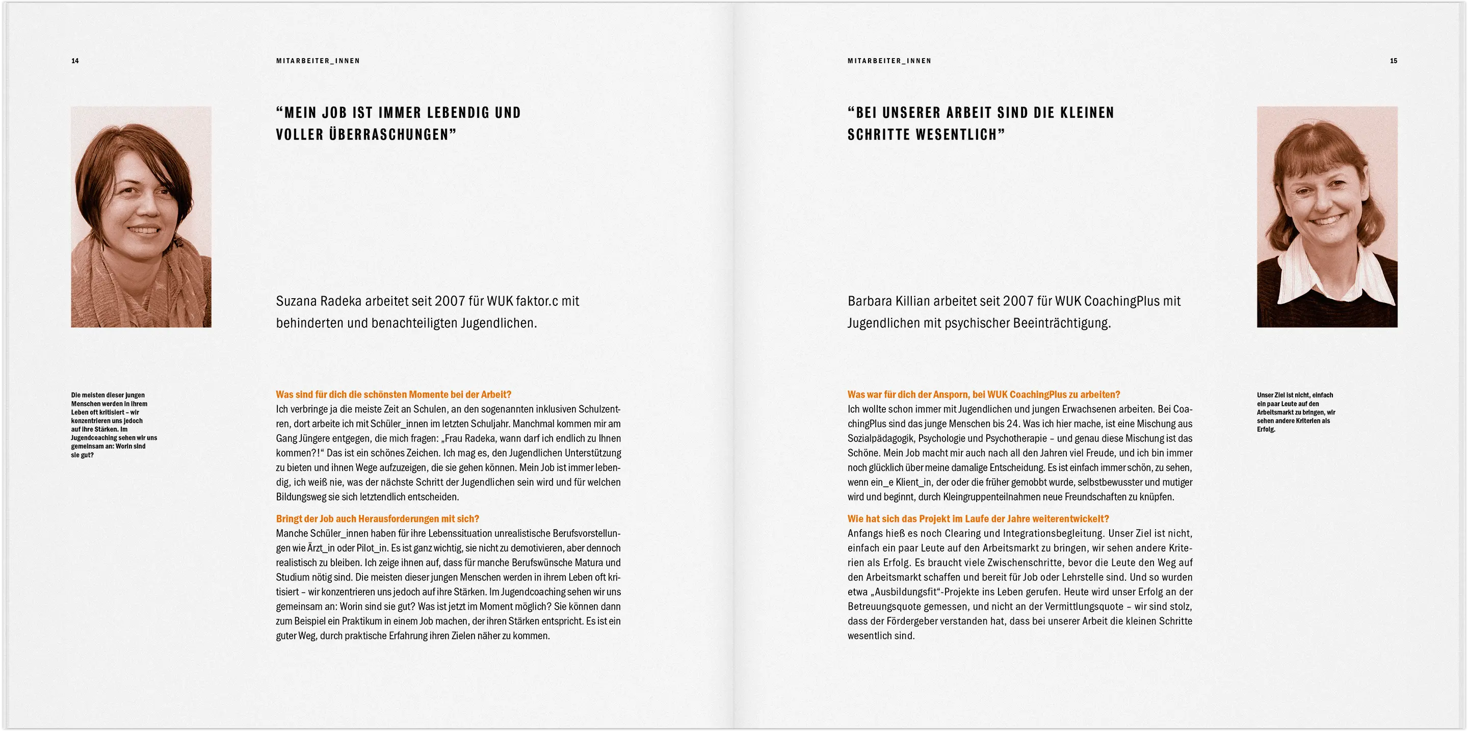 WUK Jugendcoaching. Präsentation des Projektes zum 10 Jahres Jubiläum. In Form einer Imagebroschüre und eines Imagevideos sollte die Arbeit in den Projekten präsentiert werden. Das neue Branding für die Projekte lieferte die gestalterische Basis für die Gestaltung von Broschüre und Video.